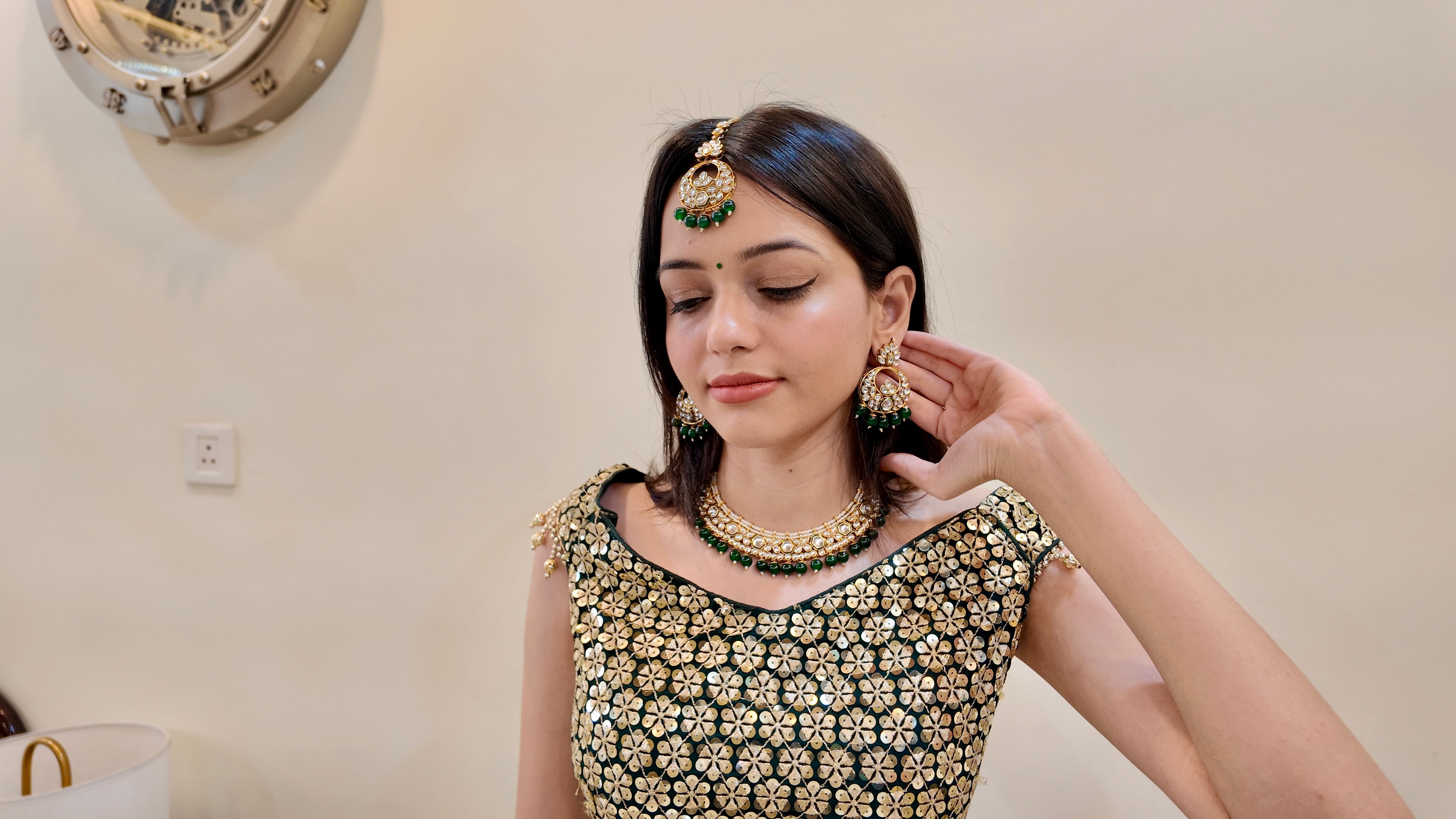 Our earrings collection has trending earring sets in antique gold, kundan (jhumkas) and ad style.
